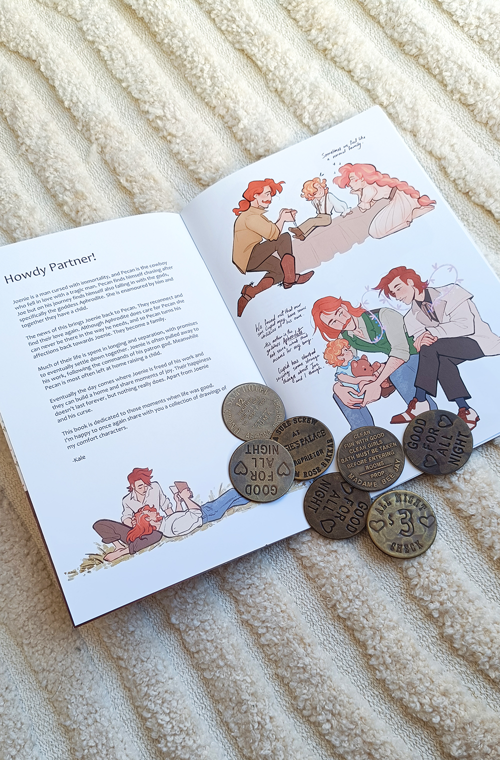 Joenie is a man cursed with immortality, and Pecan is the cowboy who fell in in love with a tragic man. Wander with Me is an artbook narrated by Pecan as he the recounts happy moments with the man he loves.